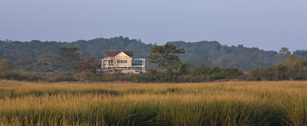 From the outset the project also required careful consideration and navigation of environmental conditions and regulations. The site, which is on a narrow spit of land bounded by the Long Island Sound and a tidal creek, is in a high-velocity flood zone that is subject to hurricane-force winds and adjacent to sensitive tidal wetlands. The new building could not exceed the footprint of the original or encroach on existing setbacks from mean high water.