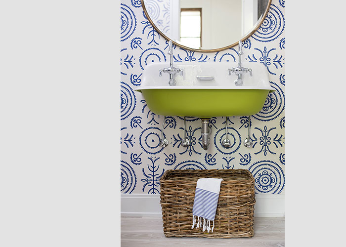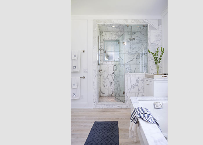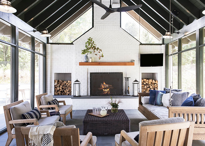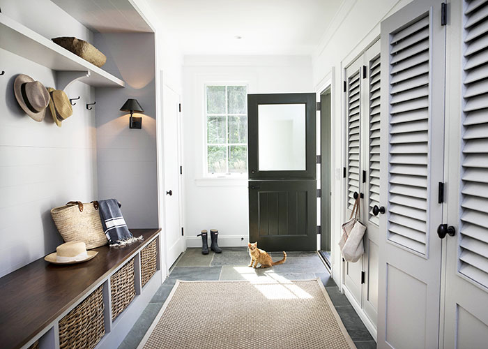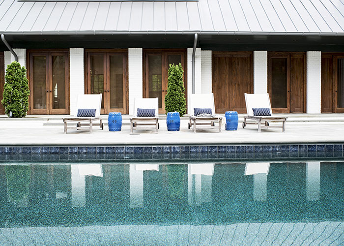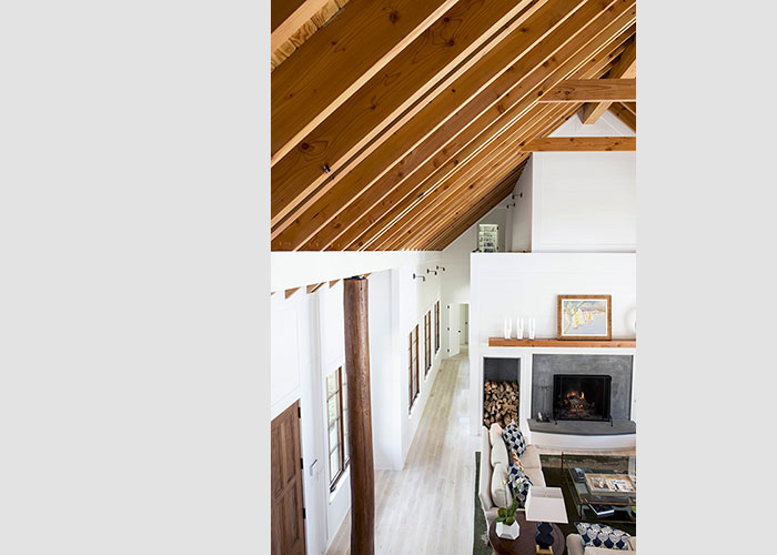 Entry from the arrival forecourt is directly into a bright and lofty great room that opens opposite to a bluestone-paved pool terrace. The natural finish of the Douglas Fir exposed rafter ceiling is contrasted with the painted wall paneling and the pickled finish of the wood floors. Just beyond the light-filled kitchen, a screen porch with fireplace and hanging daybed divides the pool area from lawn and woodland to the west.