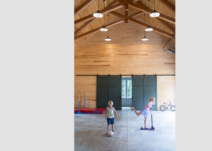 At the opposite end of the west wing the garage doubles as an airy pavilion for parties and children's play. It features a high timber trussed ceiling, clerestory windows, and pine paneling.
