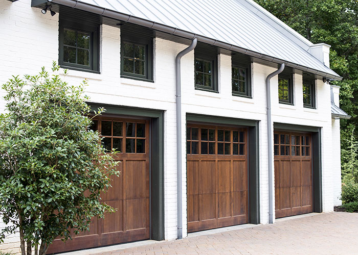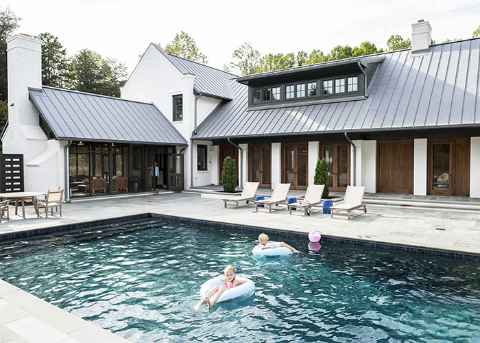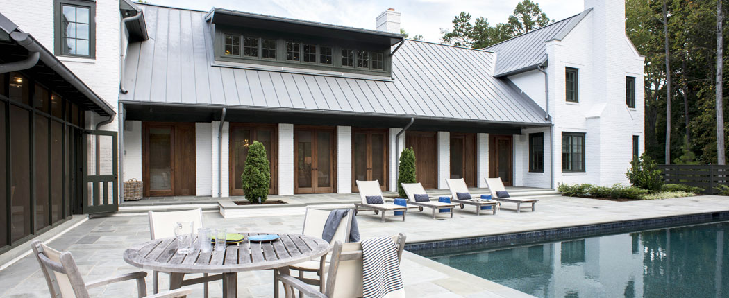 This 5,600 square foot home for a young family is set on a secluded 7.5 acre property close to Winston-Salem. A single story central volume with deep projecting eaves is bracketed by the gabled parapet end walls of flanking two story wings. Dark green wood trim is set against a neutral palette of white painted brick and gray standing seam zinc roofing.